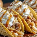 A whimsical twist on classic apple pie, these Apple Pie Tacos combine cinnamon-spiced apples with crispy vanilla wafers and a drizzle of caramel.
