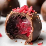 Indulge in these rich dark chocolate truffles filled with fresh raspberries, perfect for any occasion.