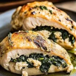 A comforting dish featuring chicken breasts stuffed with creamy spinach and cheese filling, perfect for a cozy dinner.